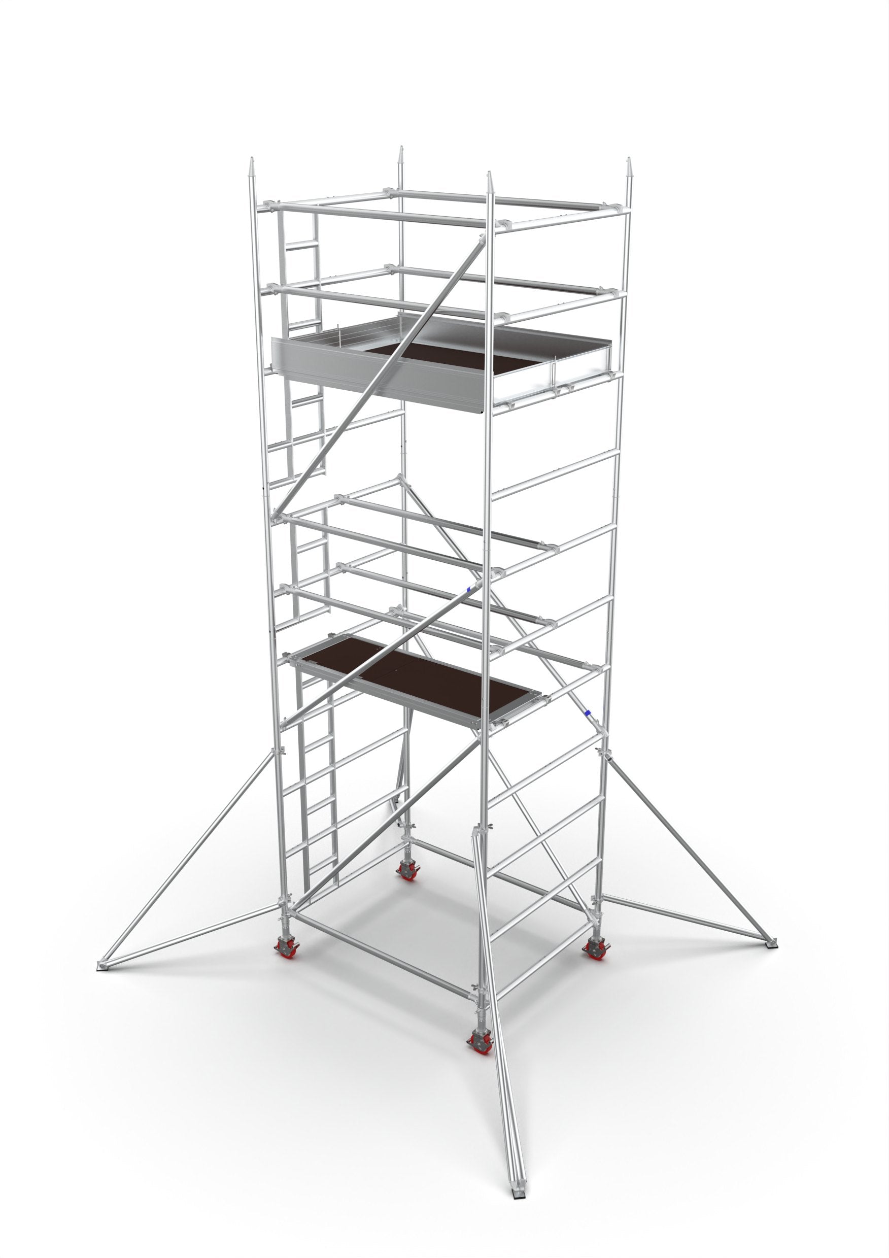 Limited only by the EN 1004 standard, the maximum free standing platform height is 8 metres for outdoor use (where the tower is exposed to wind loads) and 12 metres for indoor use (in sheltered conditions with negligible wind). Want to build it higher? No problem. Contact us today to discuss your options, or see our Tower Breifing Notes on Tied In Towers.